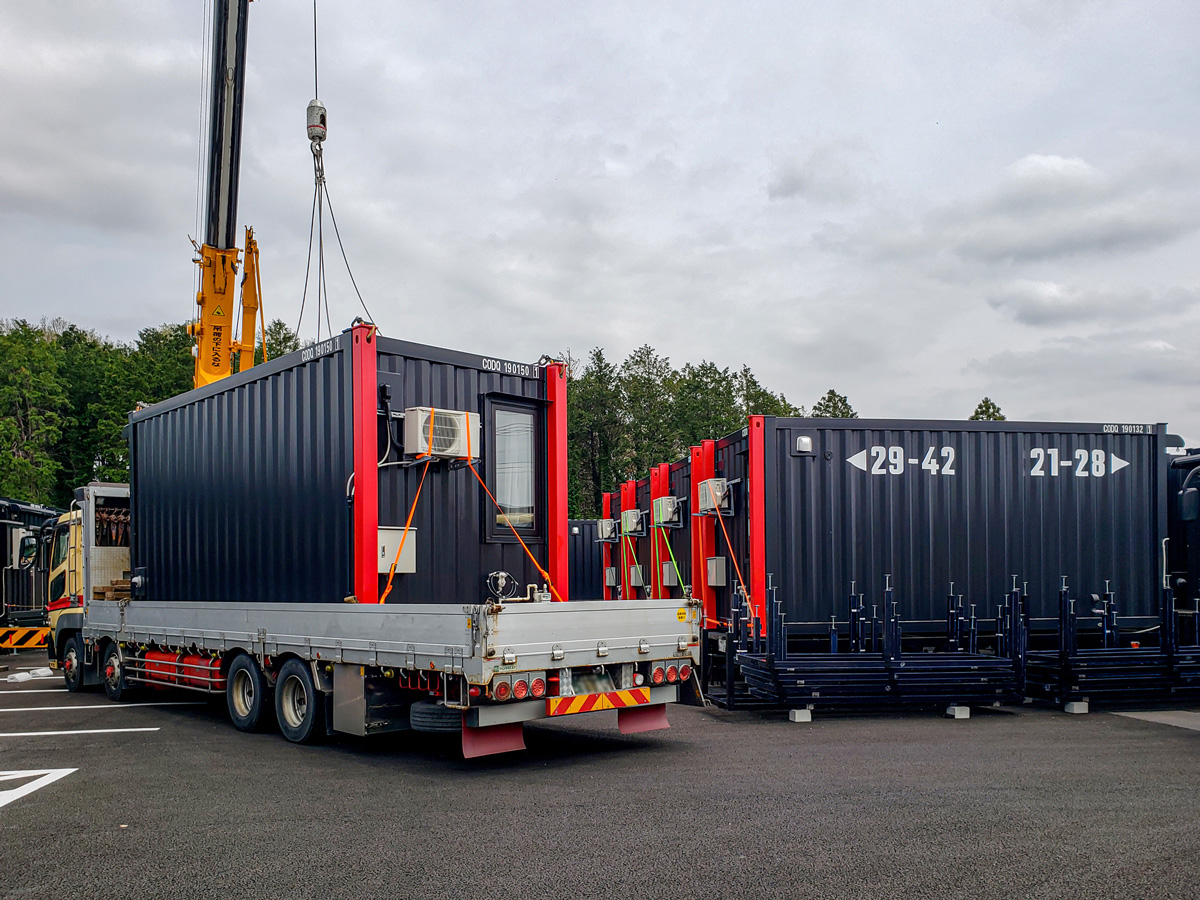 出動決定を受け、2020年4月27日と28日に千葉県成田市と栃木県足利市から合計50室が長崎に向けて出発しました。4月29日より長崎県長崎市の三菱重工業長崎造船所敷地内での設置工事が始まっています。