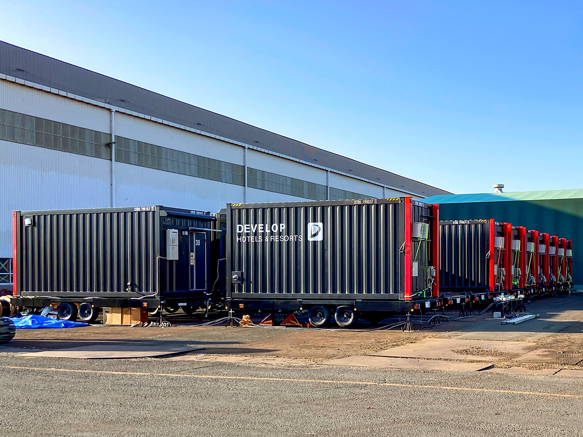 デベロップは、コンテナホテルの特長を活かした世界初の災害対応ソリューション「レスキューホテル」で初となる有事出動として、長崎に停泊中のクルーズ船内の新型コロナウイルス感染拡大防止を目的に、日本国政府、長崎県およびクルーズ船会社からの要請を受け、千葉県成田市および栃木県足利市から全50室を初回分として長崎に移送しました。